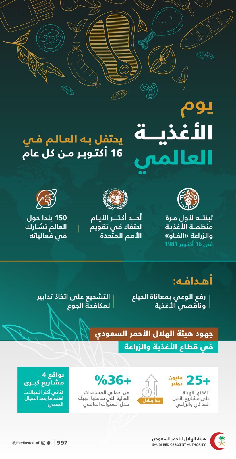 وأوضح المتحدث الرسمي باسم هيئة الهلال الأحمر السعودي، عبدالعزيز الصوينع، بمناسبة يوم الأغذية العالمي، الذي يتم الاحتفاء به في 16 أكتوبر من كل عام، أن الهيئة أقامت 4 مشاريع كبرى للأمن الغذائي، بواقع 12.5% من إجمالي المشاريع الإنسانية والإغاثية التي أقامها الهلال الأحمر السعودي في مختلف بلدان العالم الأكثر احتياجاً، لتأتي في المرتبة الثانية بعد المشاريع الصحية.
