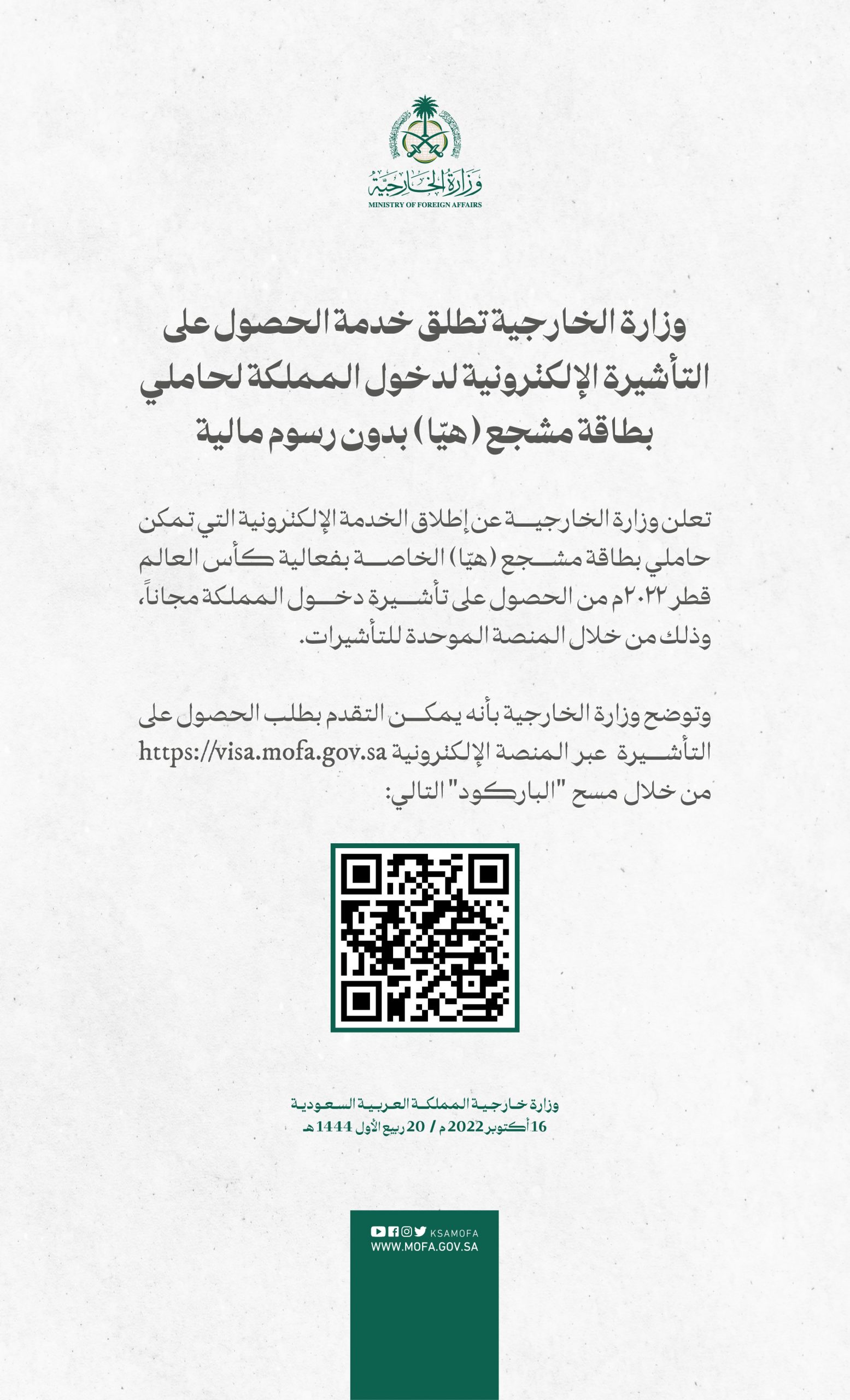 #وزارة_الخارجية تطلق خدمة الحصول على التأشيرة الإلكترونية لدخول المملكة لحاملي بطاقة مشجع (هيّا) دون رسوم مالية.