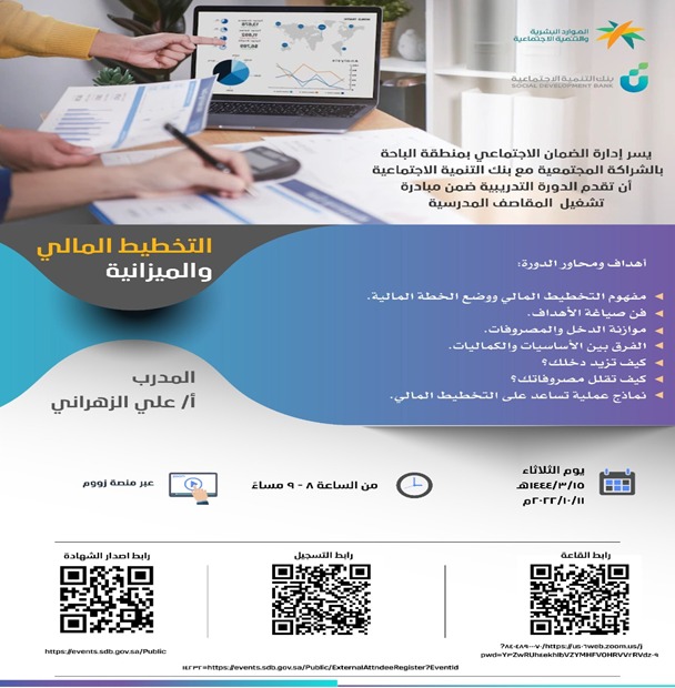 نفذ مكتب الضمان الاجتماعي بمحافظة بلجرشي والتابعة لفرع وزارة الموارد البشرية والتنمية الاجتماعية بمنطقة الباحة وبالشراكة مع بنك التنمية الاجتماعي دورة بعنوان (التخطيط المالي والميزانية) ضمن مبادرة تشغيل المقاصف المدرسية.
