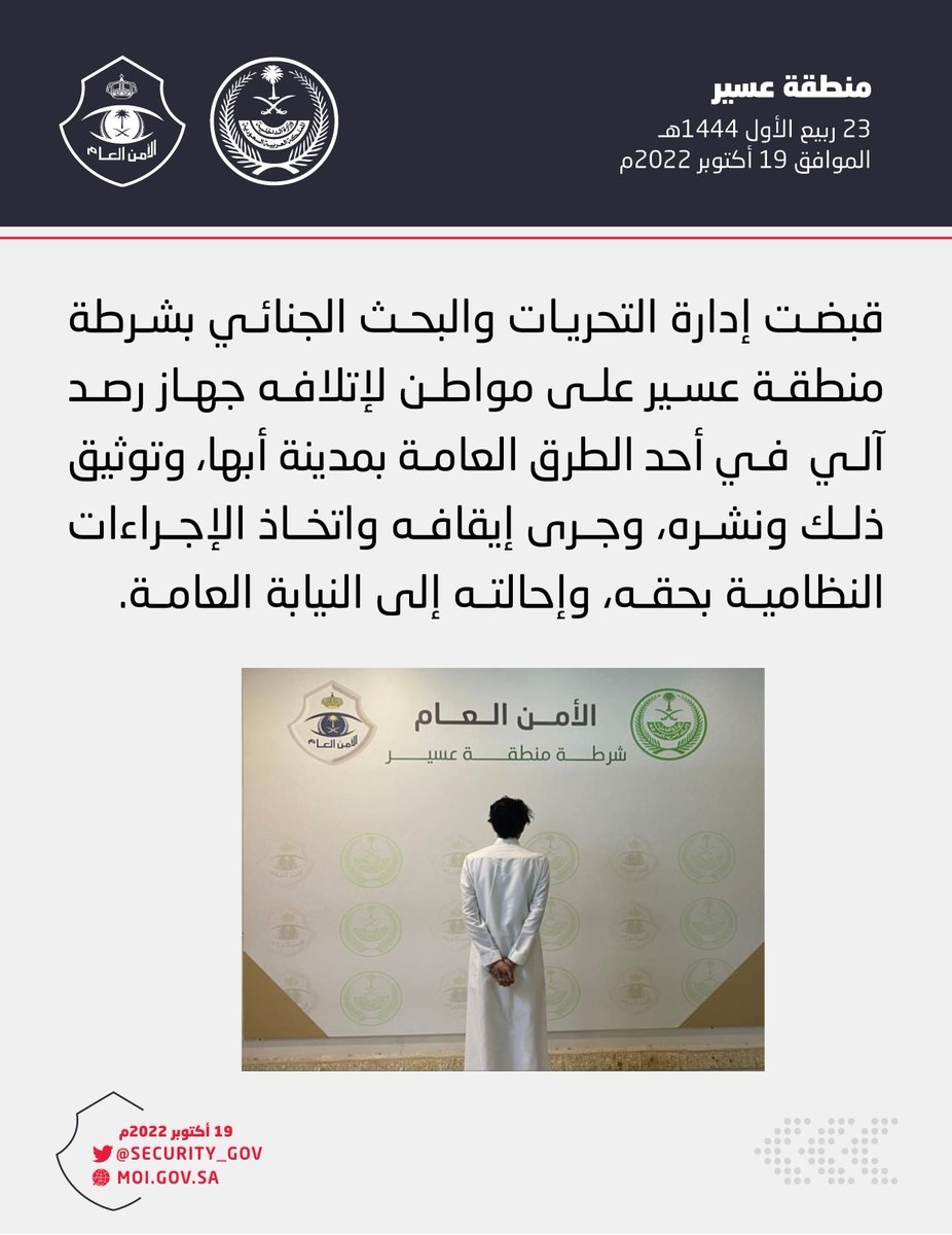 قبضت إدارة التحريات والبحث الجنائي بشرطة منطقة عسير على مواطن لإتلافه جهاز رصد آلي في أحد الطرق العامة بمدينة أبها، وتوثيق ذلك ونشره، وجرى إيقافه واتخاذ الإجراءات النظامية بحقه، وإحالته إلى النيابة العامة.
