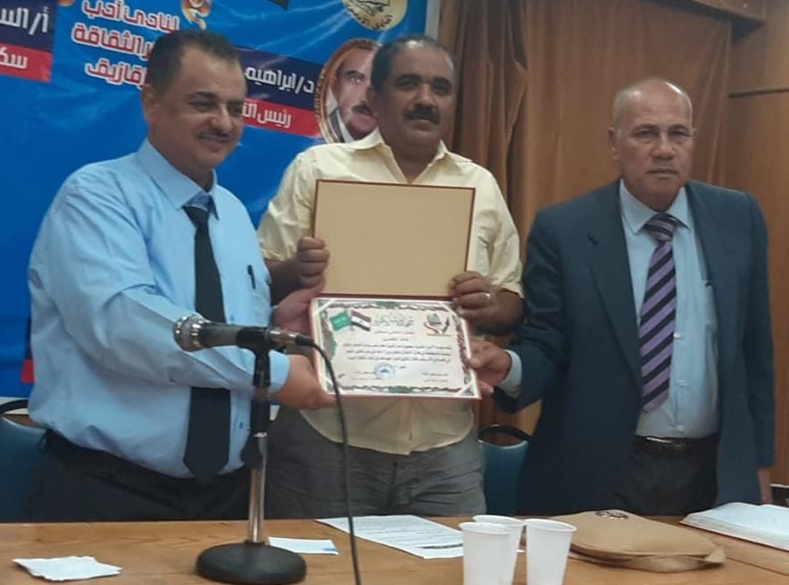 وفي الختام تم تكريم الدكتور خالد الخضري من قبل رئيس مجلس إدارة مؤسسة الأجيال المصرية الدكتور إبراهيم عطية وسكرتير نادي الأدب بالزقازيق سيد داوود بتقديم درع النادي تقديراً لجهوده الثقافية وإبداعاته الأدبية.
