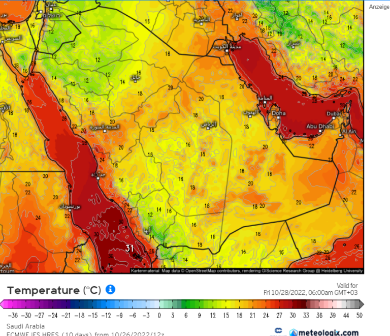 متوقع أجواء حارة نسبياً على معظم مناطق المملكة والخليج نهاراً عدا الشمالبة والمرتفعات الجبلية معتدلة نهارا”.