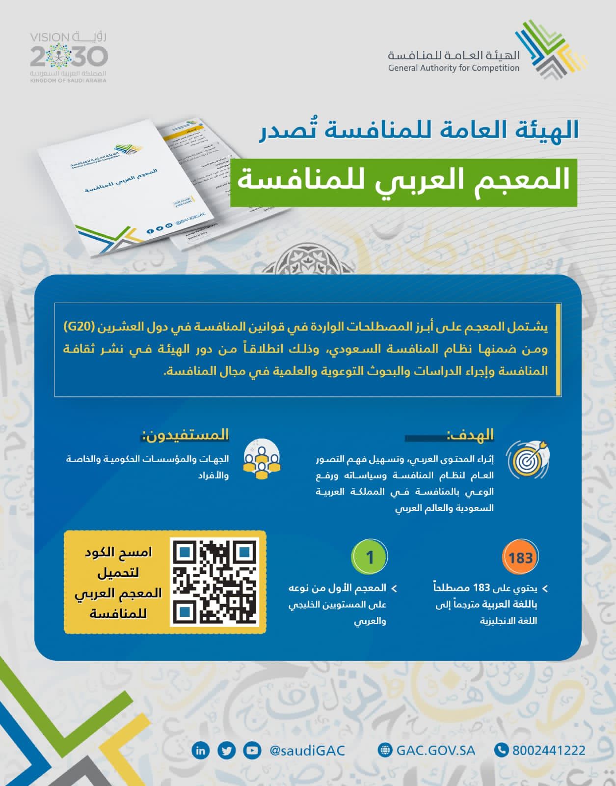 ضمن الخطوات الاستباقية للهيئة العامة للمنافسة على المستوى العربي والخليجي وانطلاقاً من دورها في نشر ثقافة المنافسة وإجراء الدراسات والبحوث وغيرها من النشاطات التوعوية والعلمية في مجال المنافسة، وذلك استناداً إلى الفقرة (3) من المادة الثالثة من تنظيم الهيئة العامة للمنافسة الصادر بقرار مجلس الوزراء رقم ( 55 ) بتاريخ 20 / 1 / 1439 ه، أصدرت الهيئة العامة للمنافسة “المعجم العربي للمنافسة”، والذي يعد الأول من نوعه على الصعيد العربي، حيث يشتمل هذاالمعجم على (183) مصطلحًا واردًا في قوانين المنافسة في دول العشرين (G20) ومن ضمنها نظام المنافسة السعودي لتستفيد منه الجهات والمؤسسات الحكومية والخاصة والأفراد. ويهدف هذا المعجم إلى إثراء المحتوى العربي، وتسهيل فهم التصور العام لنظام المنافسة وسياساته، ورفع الوعي بالمنافسة في المملكة العربية السعودية والعالم العربي من خلال تعريف وترجمة المسميات والمصطلحات الواردة في الأنظمة واللوائح المتعلقة بأعمال الهيئة العامة للمنافسة.