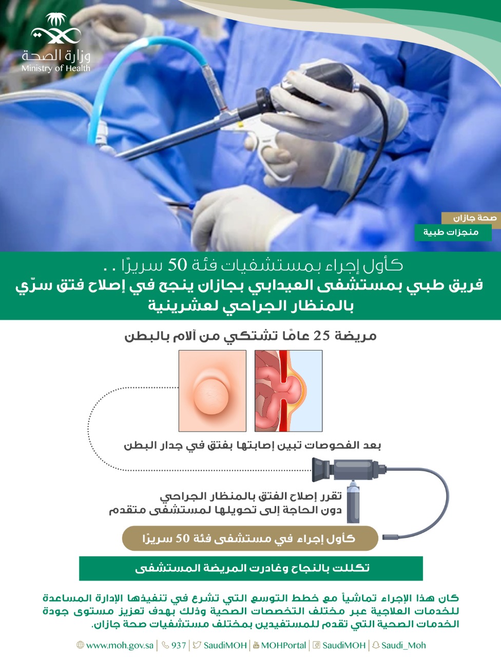 قالت الصحة في جازان بأن أطباء الجراحة العامة بمستشفى العيدابي العام تمكن من انهاء معاناة عشرينية وذلك بأجراء عملية اصلاح للفتق السري بواسطة جهاز المنظار الجراحي تكللت بالنجاح ، وذلك كأول عملية تجرى في مستشفيات فئة 50 سرير ودون الحاجة الى تحويلها الى المستشفيات المتقدمة •