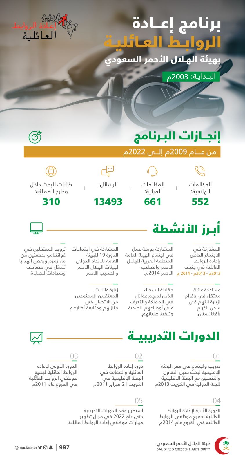 وبين الصوينع، أن برنامج الروابط العائلية يهدف إلى الحد من انفصال واختفاء أفراد الأسر وتشتيتها بشكل قسري، وإعادة الاتصال بين العائلات والحفاظ عليها والكشف عن مصير الأشخاص المفقودين، وقد نجح في سبيل ذلك، في إجراء 552 مكالمة هاتفية منذ عام 2009 وحتى الآن، إضافة 661 مكالمة مرئية، وإرسال 13493 رسالة، ومعالجة 310 طلبات بحث داخل وخارج المملكة.
