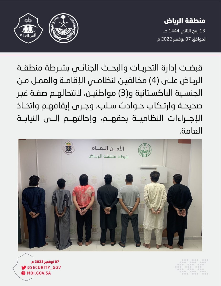 قبضت إدارة التحريات والبحث الجنائي بشرطة منطقة الرياض على (4) مخالفين لنظامي الإقامة والعمل من الجنسية الباكستانية و(3) مواطنين، لانتحالهم صفة غير صحيحة وارتكاب حوادث سلب، وجرى إيقافهم واتخاذ الإجراءات النظامية بحقهم، وإحالتهم إلى النيابة العامة.