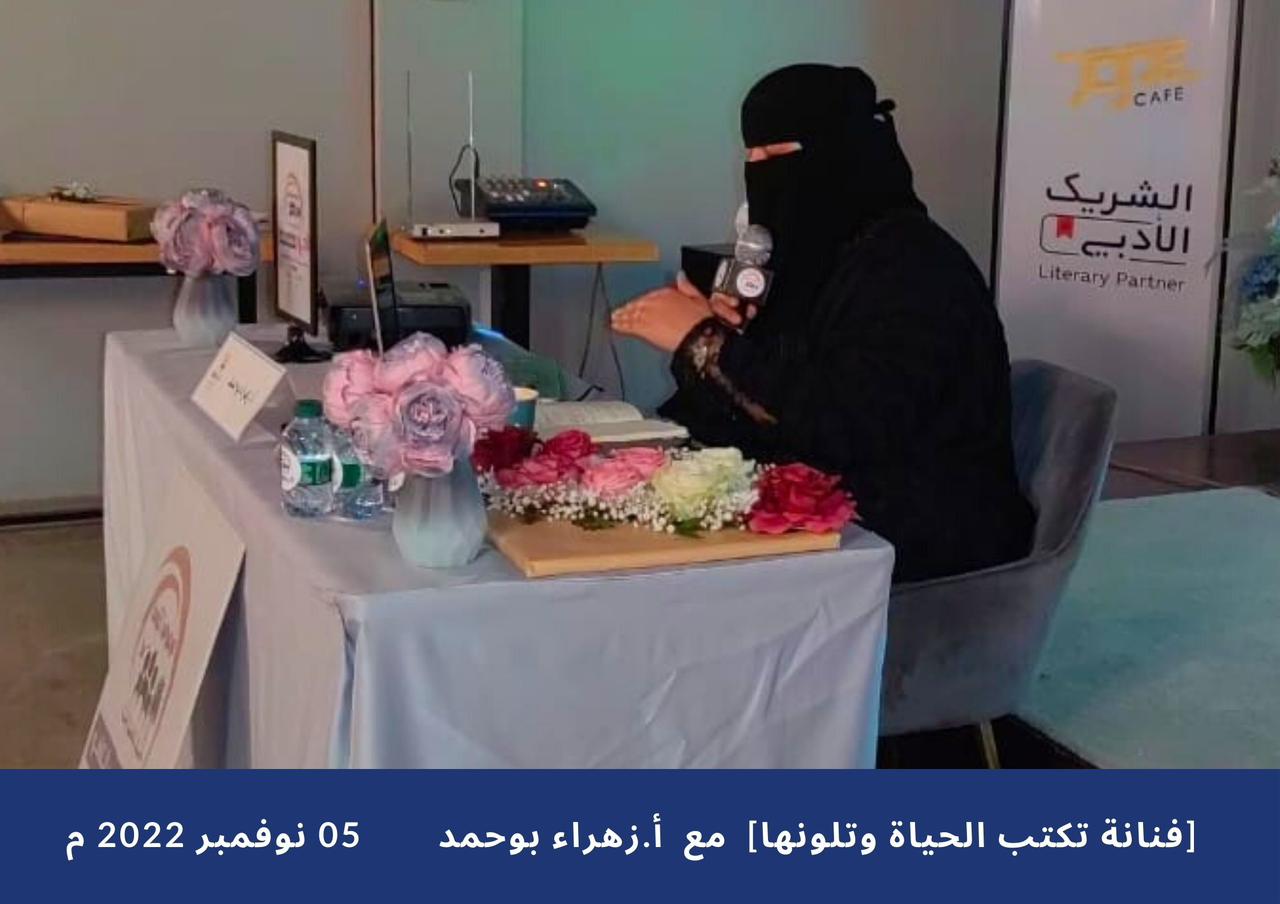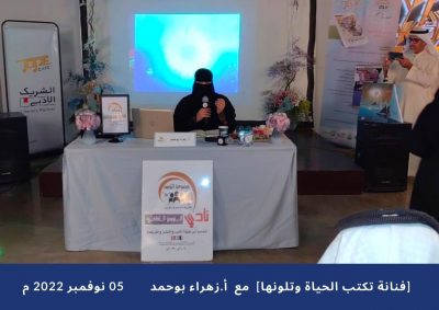 نظم نادي النورس الثقافي يوم السبت الموافق 05 نوفمبر 2022 ، 11 ربيع الثاني 1444 ھ ندوة ثقافية تحت عنوان “فنانة تكتب الحياة وتلونها”، بحضور كبار المثقفين والأدباء، وذلك لدى الشريك الأدبي لهيئة الأدب والنشر والترجمة بالهفوف.