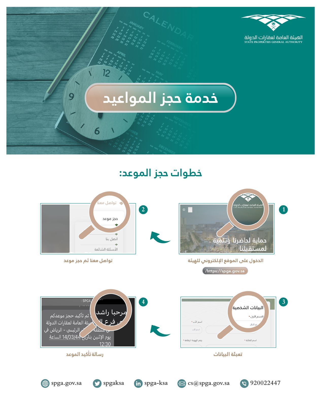 أعلنت الهيئة العامة لعقارات الدولة عن تطوير خدمة حجز المواعيد إلكترونياً للراغبين في زيارة فروعها المنتشرة في مختلف مدن المملكة سعياً منها في تحسين تجربة المستفيدين، وتطبيق أفضل المعايير لرفع مستوى جودة الخدمات، كما يأتي هذا التطوير في إطار إستراتيجية الهيئة في التحول الرقمي لخدمات الهيئة من خلال أتمتة الإجراءات وتحقيق التميز المؤسسي.