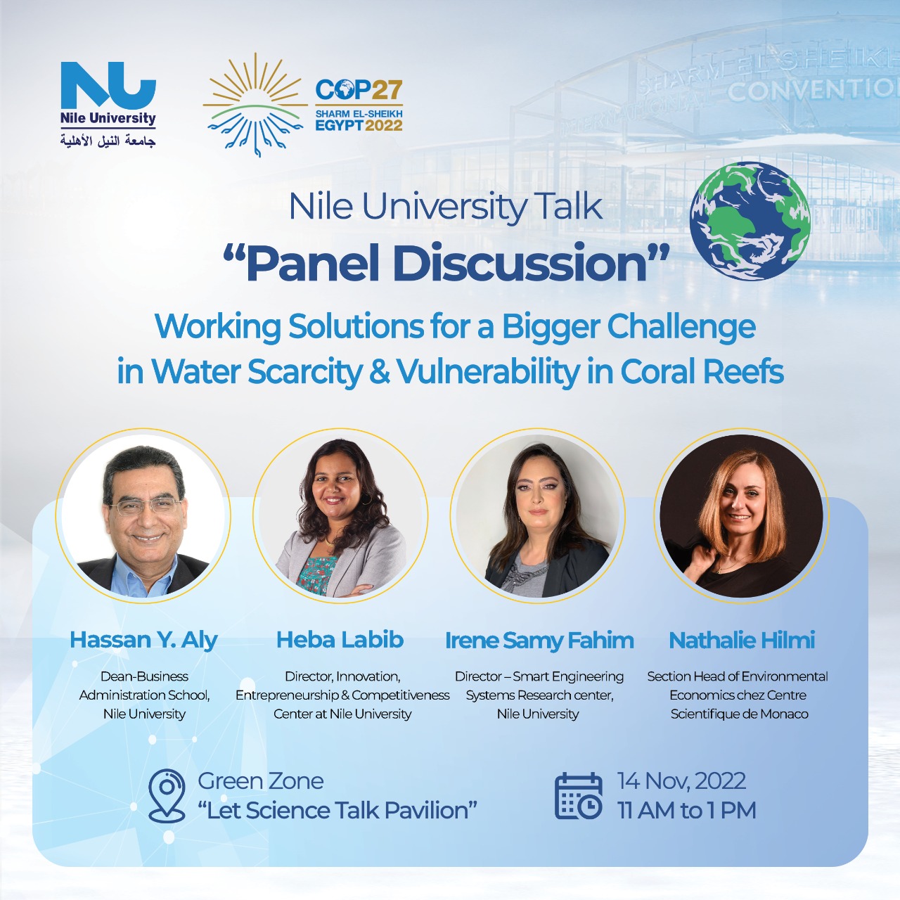 حلقة نقاشية لجامعة النيل الأهلية بالمنطقة الخضراء في COP 27 حول “ندرة المياه وتأثيراتها “