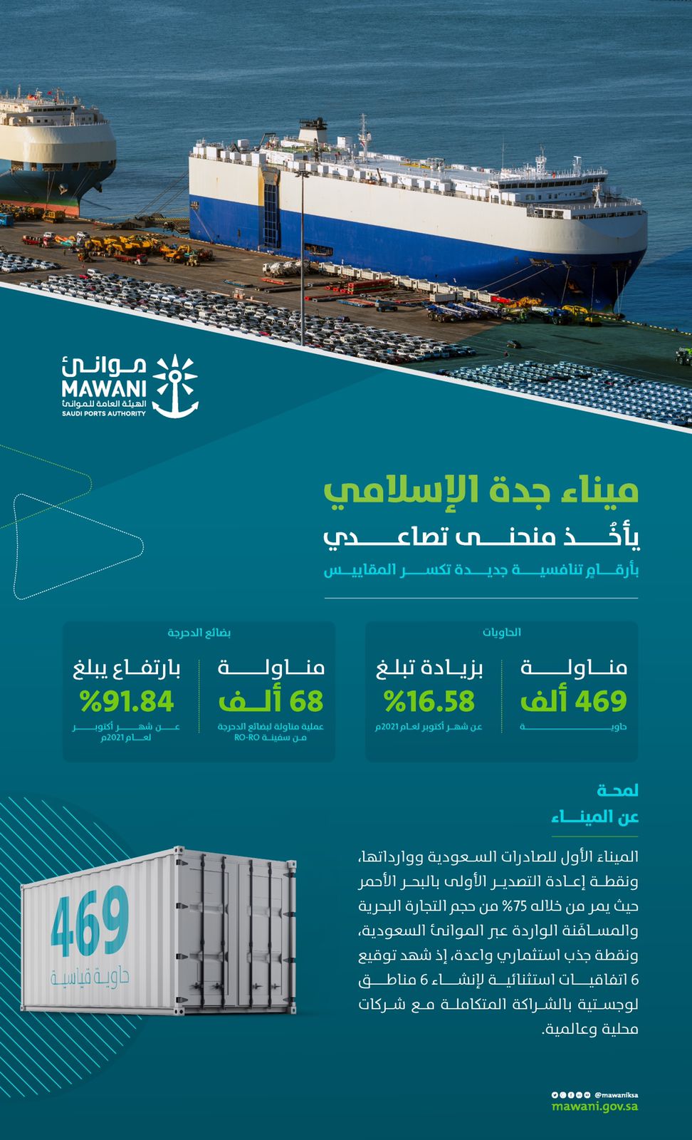 حقَّق ميناء جدة الإسلامي رقمًا قياسيًا جديدًا بمناولة 468,550 حاوية خلال شهر أكتوبر لعام 2022م بزيادة نسبتها 16.54% عن شهر أكتوبر لعام 2021م الذي سجل 402,061 حاوية.