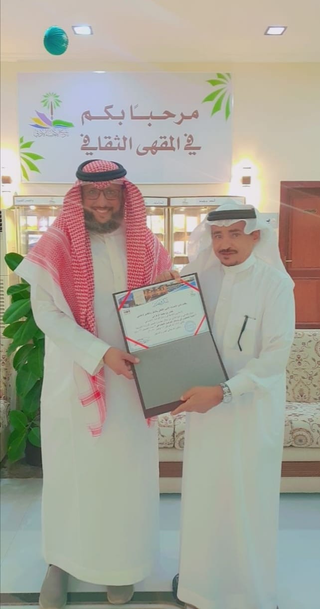 كرم نادي الأحساء الأدبي الثقافي ممثلاً في رئيسه البروفيسور ظافر الشهري الإعلامي الأستاذ خضر الزهراني لجهوده المميزة في أبراز أنشطة وبرامج النادي ومشاركته في ورشة كتابة المحتوى في وسائل التواصل الإجتماعي.
