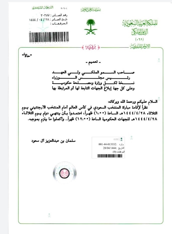 صدرت توجيهات للوزارات والجهات الحكومية، باعتماد نهاية دوام اليوم الثلاثاء الساعة 12 ظهرًا؛ وذلك نظرًا لإقامة مباراة المنتخب السعودي أمام المنتخب الأرجنتيني في كأس العالم الساعة الواحدة ظهرًا.