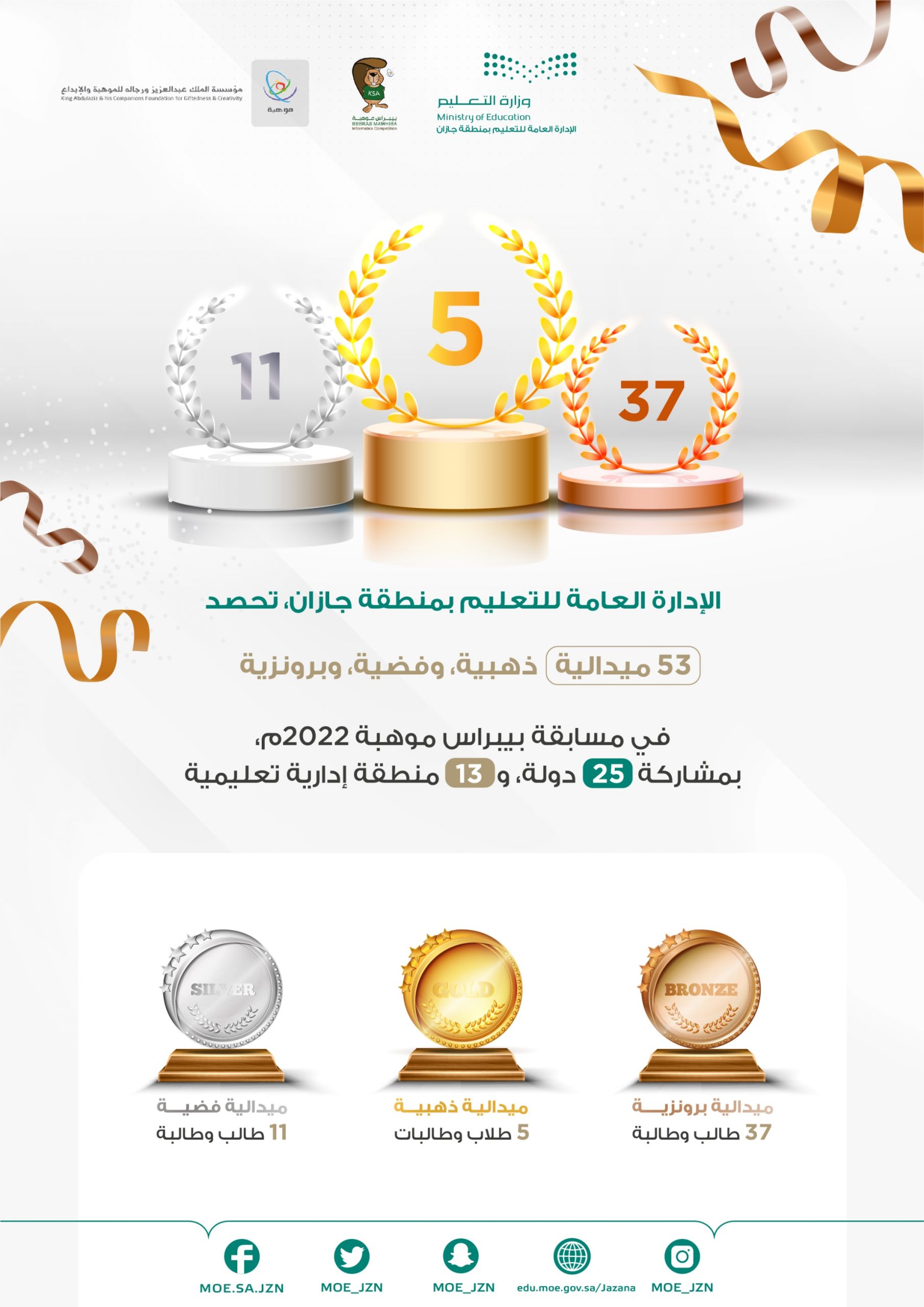 وحصد طلبة تعليم جازان على 5 ميداليات ذهبية و11 فضية و37 برونزية، متقدمين على أقرانهم من 25 دولة و13 منطقة إدارية تعليمية بالمملكة، إضافةً إلى تأهل 7 طلاب وطالبتين من المرحلة المتوسطة من الحاصلات على الميداليات إلى مسار المعلوماتية للأولمبيادات الدولية.