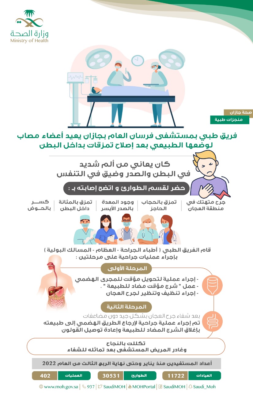 تمكن فريق طبي بمستشفى فرسان العام من إعادة أعضاء مصاب لوضعها الطبيعي بعد إصلاحه لتمزقات بداخل البطن.
