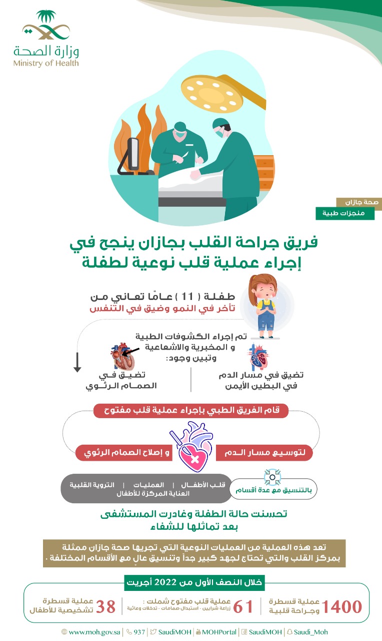 وفي التفاصيل أوضحت صحة جازان بأن الطفلة حضرت للمستشفى وكانت تعاني من تأخر في النمو وضيق في التنفس ، وبعد إجراء الكشف الطبي والإشعاعي والمخبري اللازم أتضح وجود تضيق في مسار الدم في البطين الأيمن وتضيق في الصمام الرئوي •