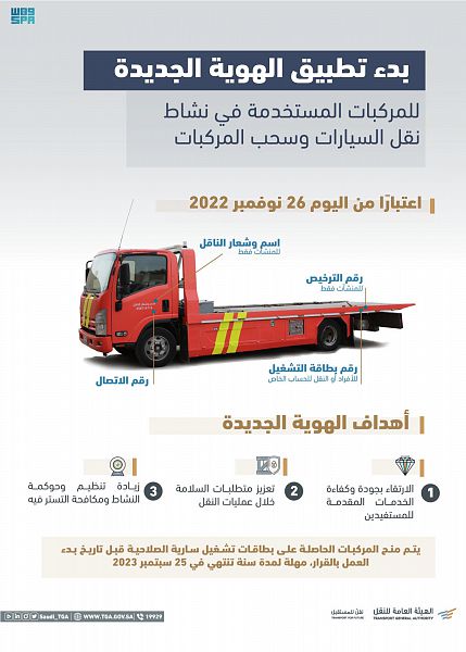 أعلنت الهيئة العامة للنقل عن بدء تطبيق الهوية الجديدة للمركبات المستخدمة في نشاط نقل السيارات وسحب المركبات، ابتداءً من اليوم.