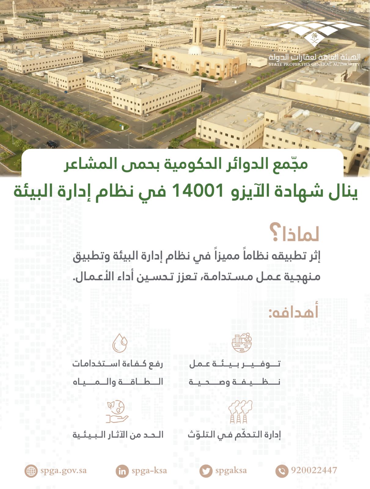 نال مجمع الدوائر الحكومية بحمى المشاعر المقدسة في مكة المكرمة التابع للهيئة العامة لعقارات الدولة، على شهادة الآيزو لنظام الإدارة البيئية (ISO 14001) ، إثر تطبيقه نظاماً مميزاً في نظام إدارة البيئة وتطبيق منهجية عمل مستدامة، تعزز تحسين أداء الأعمال، من خلال أفكار جديدة تسهم في خفض التكاليف التشغيلية ورفع كفاءة استخدامات الطاقة والمياه، إضافةً إلى أعمال الصيانة والتشغيل، والقدرة على التحكّم في مستوى التلوّث، والحد من الآثار البيئية، والتأهب للطوارئ والاستجابة لها، وتحسين الأوضاع البيئية للموظّفين بتوفير بيئة نظيفة وآمنة وخالية من الملوّثات.