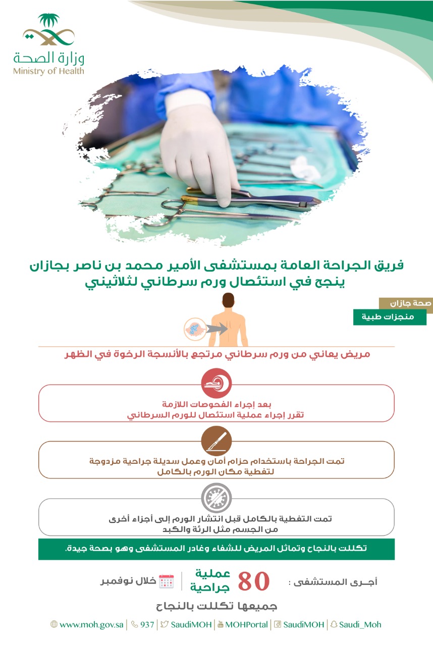 وفي التفاصيل ذكرت صحة جازان بأن المريض حضر للمستشفى وكان يعاني من ورم سرطاني مرتجع بالأنسجة الرخوة في الظهر.