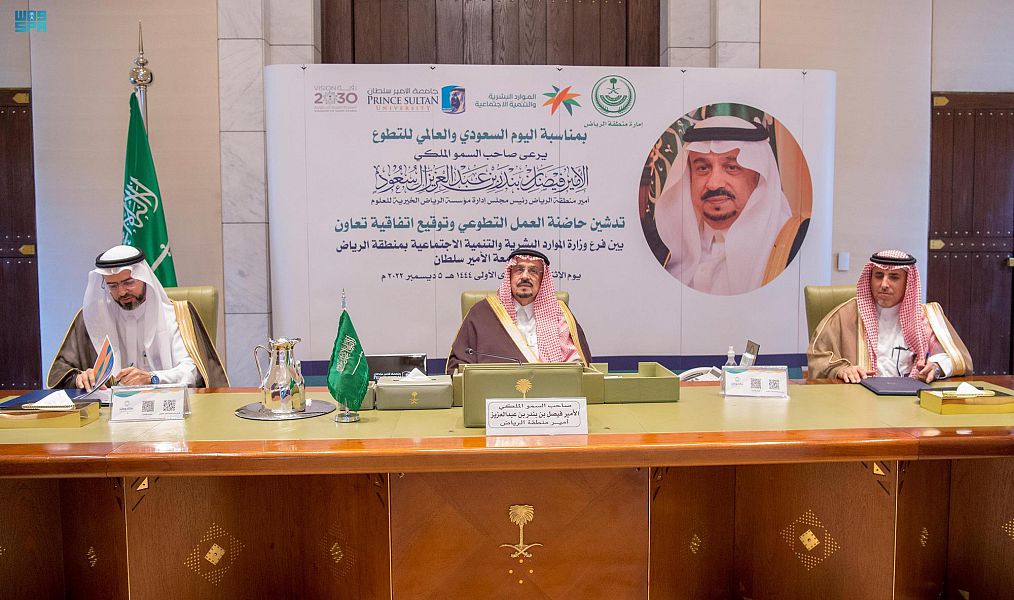 رعى صاحب السمو الملكي الأمير فيصل بن بندر بن عبدالعزيز أمير منطقة الرياض بقصر الحكم اليوم حفل تدشين حاضنة العمل التطوعي بالمنطقة وذلك بالتزامن مع اليوم العالمي للتطوع, كما جرى توقيع اتفاقية بين فرع وزارة الموارد البشرية والتنمية الاجتماعية بمنطقة الرياض وجامعة الأمير سلطان في مجال العمل التطوعي.