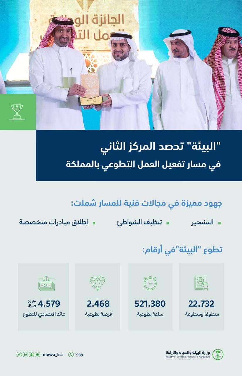 حققت وزارة البيئة والمياه والزراعة المركز الثاني عن فئة مسار تفعيل العمل التطوعي على مستوى مناطق المملكة في عام 2022م