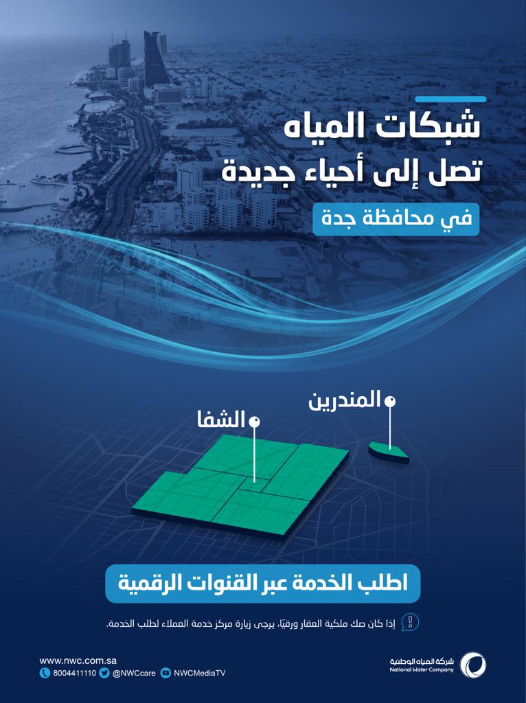 أعلنت شركة المياه الوطنية بدء استقبال طلبات التوصيلات المنزلية للمياه في عدد من أحياء محافظة جدة، مؤكدة أنها انتهت من أعمال إيصال شبكات المياه إلى أحياء جديدة بمحافظة جدة، منها حيي (المندرين، الشفاء)، مبينة أن أطوالها تجاوزت (26.953) مترًا طوليًا لخدمة نحو (26) ألف مستفيد.
