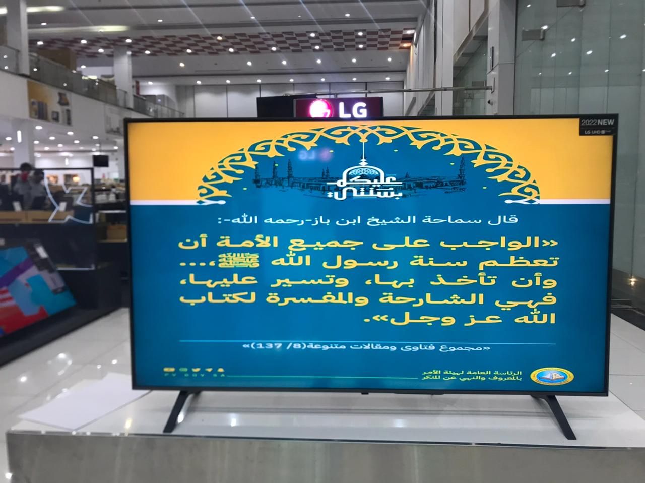 فعلت هيئة الأمر بالمعروف والنهي عن المنكر بمدينة الباحة وهيئة محافظة بلجرشي المحتوى التوعوي لحملة “عليكم بسنّتي” في المراكز التجارية والأسواق والمتنزهات العامة.وذلك لتعزيز السنة النبوية والعناية بها عبر الشاشات الإلكترونية واللوحات التوعوية.