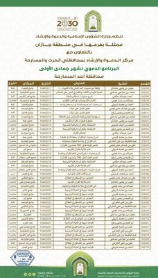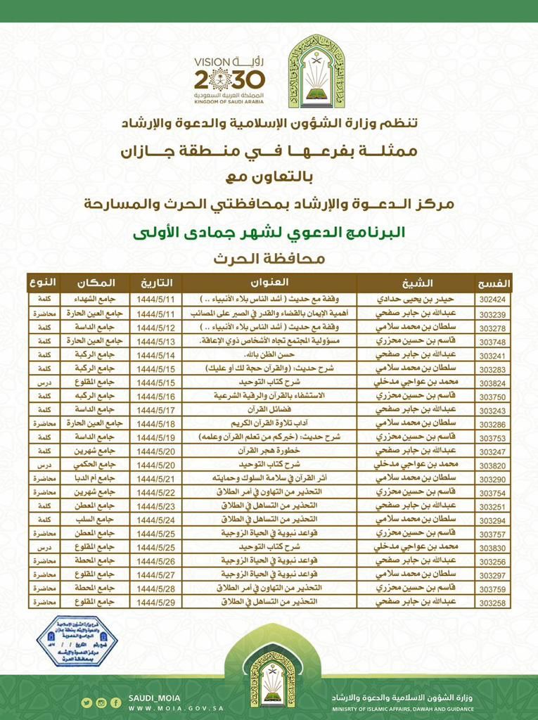 الشؤون الإسلامية بجازان تواصل تنفيذ البرنامج الدعوي لجمادى الأولى بالمسارحة والحُرّث