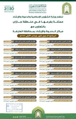 الشؤون الإسلامية بجازان تنظم البرنامج الدعوي لشهر جمادى الأولى بالعارضة