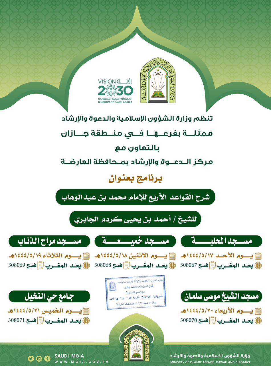 يُنظم فرع وزارة الشؤون الإسلامية والدعوة والإرشاد في منطقة جازان ممثلًا بمركز الدعوة بمحافظة العارضة البرنامج الدعوي لشهر جمادى الأولى 1444 للهجرة وينطلق مساء غدٍ الجمعة الموافق 15 / 5 / 1444 هـ , بعدد من الكلمات الدعوية والتي تتحدث عن ” فضل الصبر على البلاء ” وتُقام في جامع بريقع وجامع قائم ملفي .
