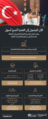 يُذكر أن منصة “نسك” تقدم حزمة واسعة من الخدمات والمعلومات للمعتمرين والزوار تمكنهم من أداء نسك العمرة بيسر وسهولة، وتمكن “نسك” الراغبين في أداء العمرة أو الزيارة من إصدار التأشيرات والتصاريح اللازمة، وحجز الباقات والبـرامج إلكترونيًا، ويمكن زيارة الموقع الإلكتروني لمنصة “نسك” باللغة التركية على الرابط: nusuk.sa/tr.
