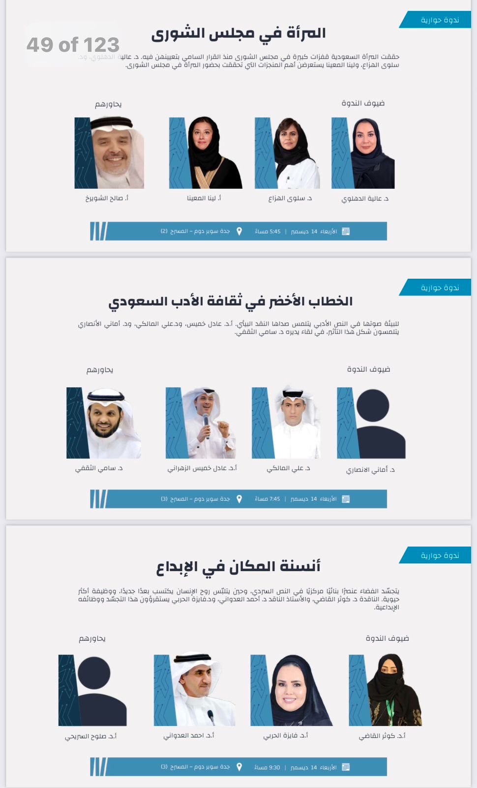 يسجل معرض جدة للكتاب 2022، الأربعاء، حضوراً ثرياً لشعراء وروائيي لبنان والعراق والمملكة، الذين يُثْرُون الندوات والجلسات الحوارية والأمسيات الشعرية المقامة في يومه السابع تحت قبة (سوبر دوم).