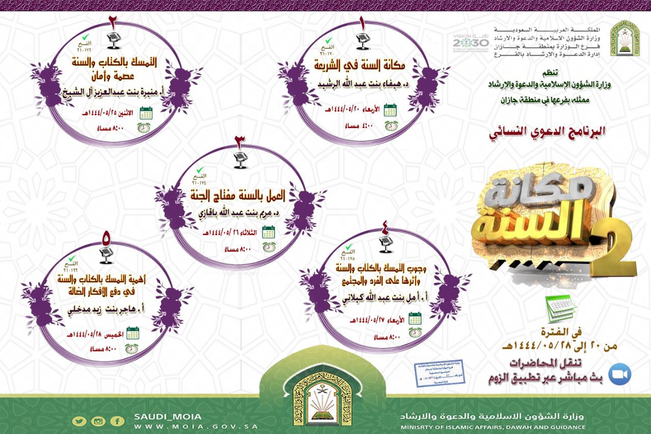 ضمن البرنامج الدعوي ( مكانة السنة ٢) الذي ينفذه فرع وزارة الشؤون الإسلامية والدعوة والإرشاد في منطقة جازان والذي يرعاه معالي الوزير الشيخ الدكتور عبد اللطيف بن عبد العزيز آل الشيخ يقيم الفرع عدد من الندوات عن طريق البث المباشرة والتي تنطلق مساء غدٍ الأربعاء العشرون من شهر جماد الأول ١٤٤٤ هجرية حيث ستتحدث فيه عدد من الداعيات المتعاونات عن عدة مواضيع مهمة كمكانة السنة في الشريعة ، وأن التمسك بالكتاب والسنة عصمة وأمان ، ويبين أن العمل بالكتاب والسنة مفتاح الجنة ، وكذلك وجوب التمسك بالكتاب والسنة وأثرهما على الفرد والمجتمع ، وتختتم هذه الندوات بتوضيح أهمية التمسك بالكتاب والسنة في دفع الأفكار الضالة .