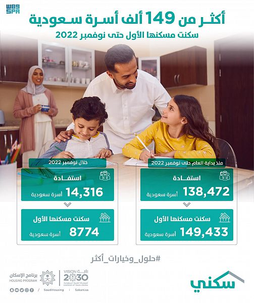 أخبار محلية > “سكني”: أكثر من 149 ألف أسرة سعودية سكنت مسكنها الأول منذ بداية العام حتى نهاية نوفمبر 2022