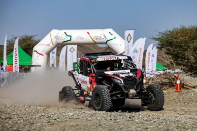01- السائق السعودي يزيد لراجحي في سيارة تويوتا “هايلوكس – أوفردرايف” في صدارة فئة “تي 1”.