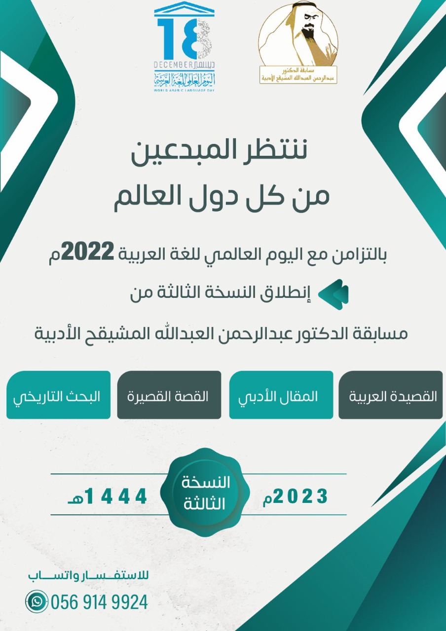 هذا وتحظى مسابقة الدكتور عبدالرحمن العبدالله المشيقح الأدبية بسمعة عالية. حيث يشترك بالمسابقة المئات من الأدباء حول العالم .. ويشرف عليها عدداً من المختصين والأكاديميين المتخصصين بالأدب العربي.