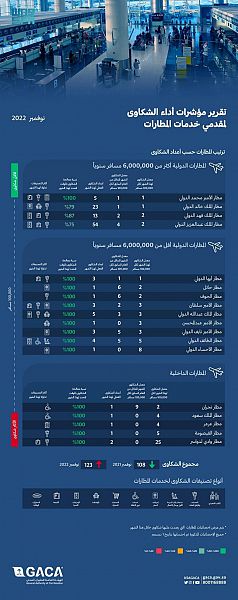 أصدرَت الهيئةُ العامة للطيران المدني اليوم، مؤشرَ تصنيف مقدمي خدمات النقل الجوي والمطارات من واقع عدد الشكاوى المرفوعة من المسافرين للهيئة خلال شهر نوفمبر 2022م.