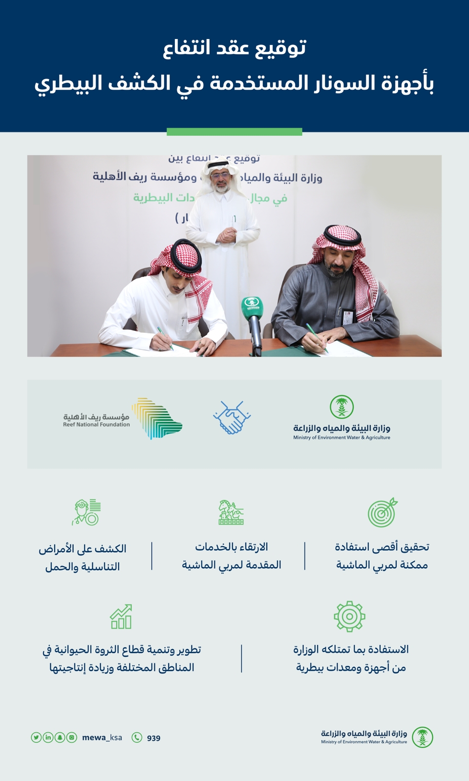 ووفقًا للعقد، تتولى مؤسسة ريف الأهلية، عملية استخدام أجهزة السونار المملوكة للوزارة، على النحو الذي يَضمن الانتفاع بها وتقديم خدمات بجودة عالية لمربي الماشية في مختلف المناطق، والمساهمة في تحقيق التنمية الزراعية وفقًا لمستهدفات رؤية 2030.