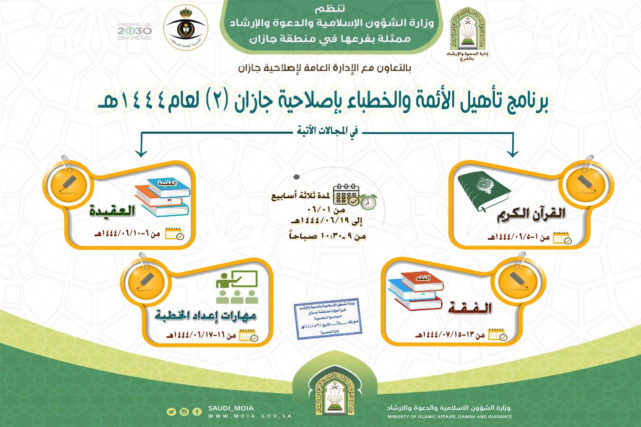 أطلق فرع وزارة الشؤون الإسلامية والدعوة والإرشاد في منطقة جازان في نسخته الثانية وبالتعاون مع الإدارة العامة لإصلاحية جازان البرنامج العلمي ( تأهيل الأئمة والخطباء ) بالإصلاحية بمشاركة عدد من الدعاة يبينون عدد من المواضيع المهمة في كتاب الله عز وجل والعقيدة والفقه كما أنه ستقام دورات تدريبة في طريقة إعداد الخطبة والإلقاء ومهاراتهما .
