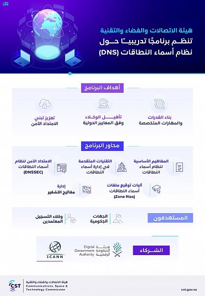 نظمت هيئة الاتصالات والفضاء والتقنية برنامجًا تدريبيًا حول نظام أسماء النطاقات (DNS)، وتقنية الامتداد الآمن (DNSSEC) بهدف الإسهام في بناء القدرات والمهارات المتخصصة في مجال أسماء النطاقات، وتعزيز جوانب الأمان والموثوقية المتعلقة بها، ورفع نسبة تبنيها في المملكة وفق أبرز المواصفات والمعايير الدولية، وذلك بالتعاون مع هيئة الحكومة الرقمية (DGA)، وهيئة الإنترنت للأسماء والأرقام المخصصة الدولية (ICANN).