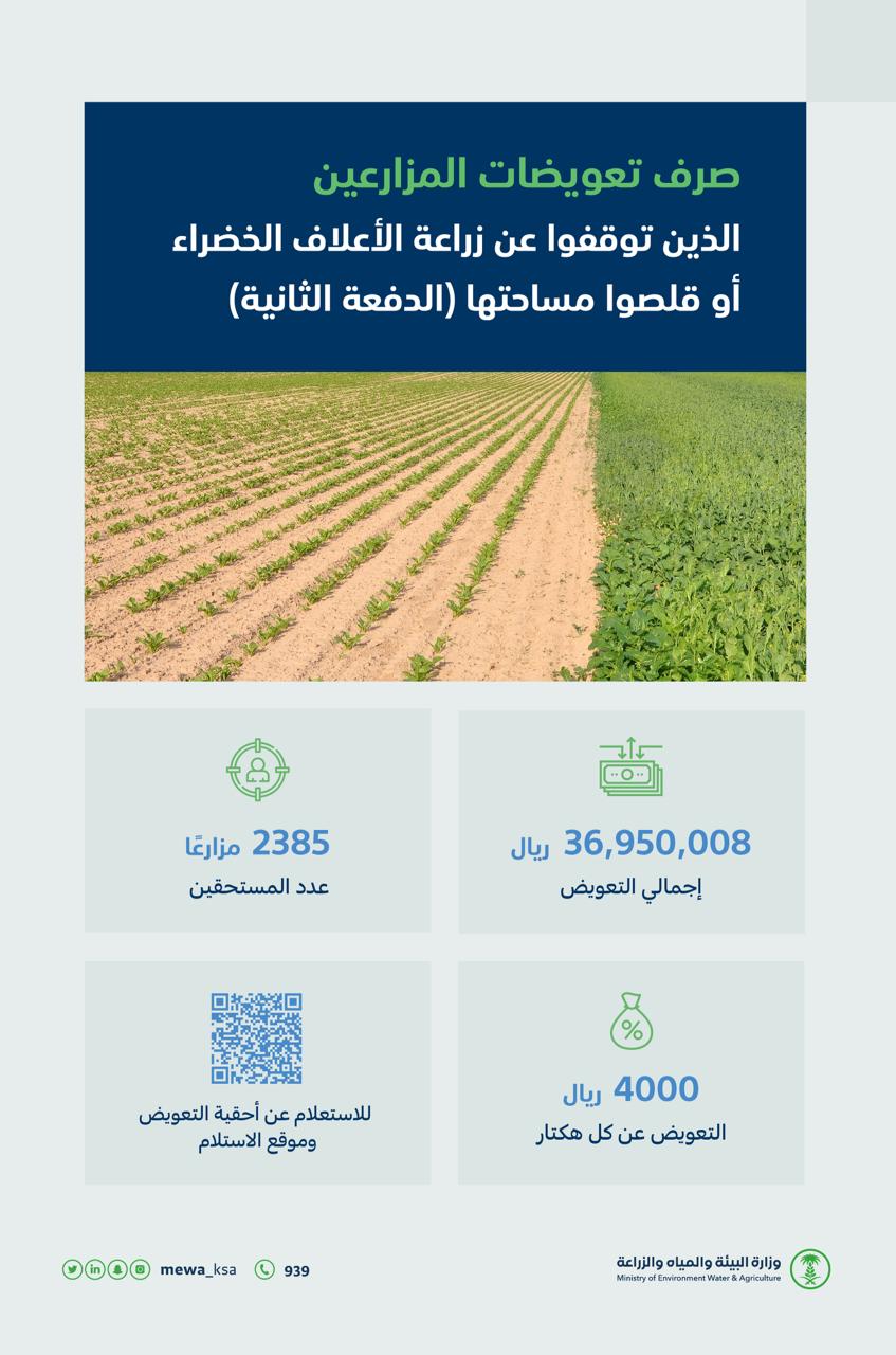 أعلنت وزارة البيئة والمياه والزراعة، بدء صرف الدفعة الثانية من تعويضات المزارعين الذين توقفوا عن زراعة الأعلاف الخضراء أو قلصوا مساحاتهم التزامًا بقرار مجلس الوزراء رقم (39) بتاريخ 16/1/1438هـ.