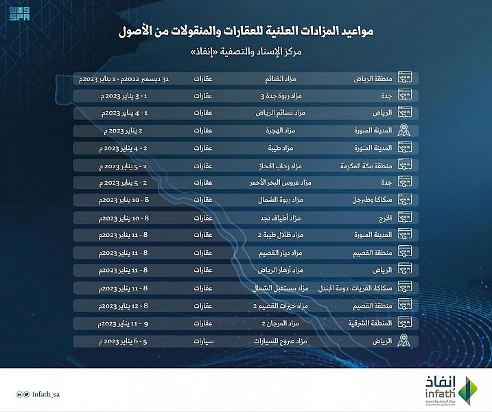 وتبدأ المزادات بمزاد الغنائم الإلكتروني الذي يُقام على 4 عقارات تقع بمنطقة الرياض، ومزاد ربوة جدة الثالث الإلكتروني المقام على عقار بمحافظة جدة، ومزاد نسائم الرياض الإلكتروني المقام على 14 عقارًا بمدينة الرياض، ومزاد الهجرة الحضوري المقام على 26 عقارًا في المدينة المنوّرة، ومزاد طيبة الإلكتروني المقام على 6 عقارات بالمدينة أيضًا، ومزاد رحاب الحجاز الإلكتروني المقام على 13 عقارًا في كل من مكة المكرمة والطائف ومحافظة تربة، ومزاد عروس البحر الأحمر الإلكتروني المقام على 3 عقارات بمحافظة جدة، ومزاد ربوة الشمال الإلكتروني المقام على 4 عقارات في كل من مدينة سكاكا وطبرجل، ومزاد أطياف نجد الإلكتروني المقام على عقار بمحافظة الخرج، ومزاد ظلال طيبة الثاني الإلكتروني المقام على عقارين بالمدينة المنوّرة، ومزاد ديار القصيم الإلكتروني المقام على 7 عقارات بمنطقة القصيم، ومزاد أزهار الرياض الإلكتروني المقام على 4 عقارات بمدينة الرياض، ومزاد مستقبل الشمال الإلكتروني المقام على 19 عقارًا تقع في كل من القريات وسكاكا ودومة الجندل، ومزاد خيرات القصيم الثاني الإلكتروني المقام على عقارين بمنطقة القصيم، ومزاد المرجان الثاني المقام على 14 عقارًا بالمنطقة الشرقية، إضافة إلى مزاد صروح الحضوري المقام على عدد من السيارات والشاحنات المتنوعة بمدينة الرياض، وللمزيد من التفاصيل حول المزادات يمكن زيارة الصفحة الخاصة بموقع إنفاذ الإلكتروني: https://infath.sa/auctions .