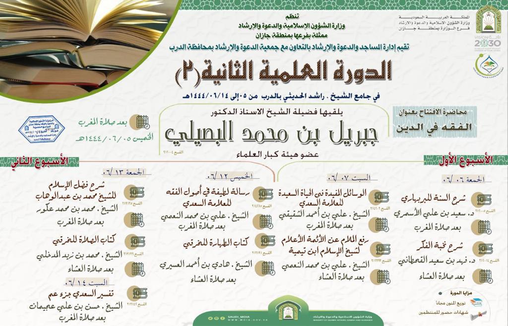 ينفذ فرع وزارة الشؤون الإسلامية والدعوة والإرشاد في منطقة جازان ممثلاً بإدارة المساجد بمحافظة الدرب وبالتعاون مع جمعية الدعوة والإرشاد وتوعية الجاليات الدورة العلمية الثانية والتي سيفتتحها معالي عضو هئية كبار العلماء الأستاذ الدكتور جبريل بن محمد البصيلي مساء اليوم الخميس الخامس من شهر جماد الثاني ١٤٤٤ هجرية بمحاضرة يبين فيها أهمية الفقه في الدين ويتحدث عن بعض المسائل الفقهية المهمة في حياة المسلم وذلك في جامع الشيخ راشد الحديثي .