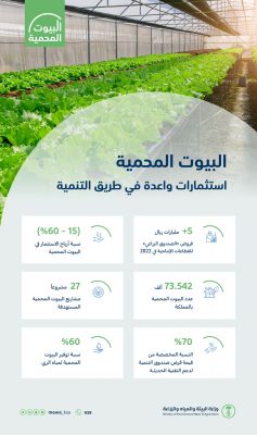 يشار إلى أن إعداد الخطة التوسعية في البيوت المحمية باستخدام التقنيات الحديثة، بدأ منذ وقت مبكر؛ حيث تم استخدام هذا النوع من الزراعة في المملكة منذ أكثر من (30) عاماً، كما شهدت الزراعة في البيوت المحمية تطوراً ملحوظًا في كل مجالاتها التقنية، والإنتاجية والوقائية، إذ تساعد البيوت المحمية في إنتاج المحاصيل في غير مواعيدها وإطالة مواسم توفرها، كما تعد عامل رئيسي لنجاح الإنتاج الزراعي المتخصص، كالزراعة العضوية، وتوفر الحماية من تأثيرات الظروف المناخية المختلفة، مثل موجات الحرارة العالية والمنخفضة على السواء، والأمطار والرياح، كما تحد من انتشار الآفات الزراعية.