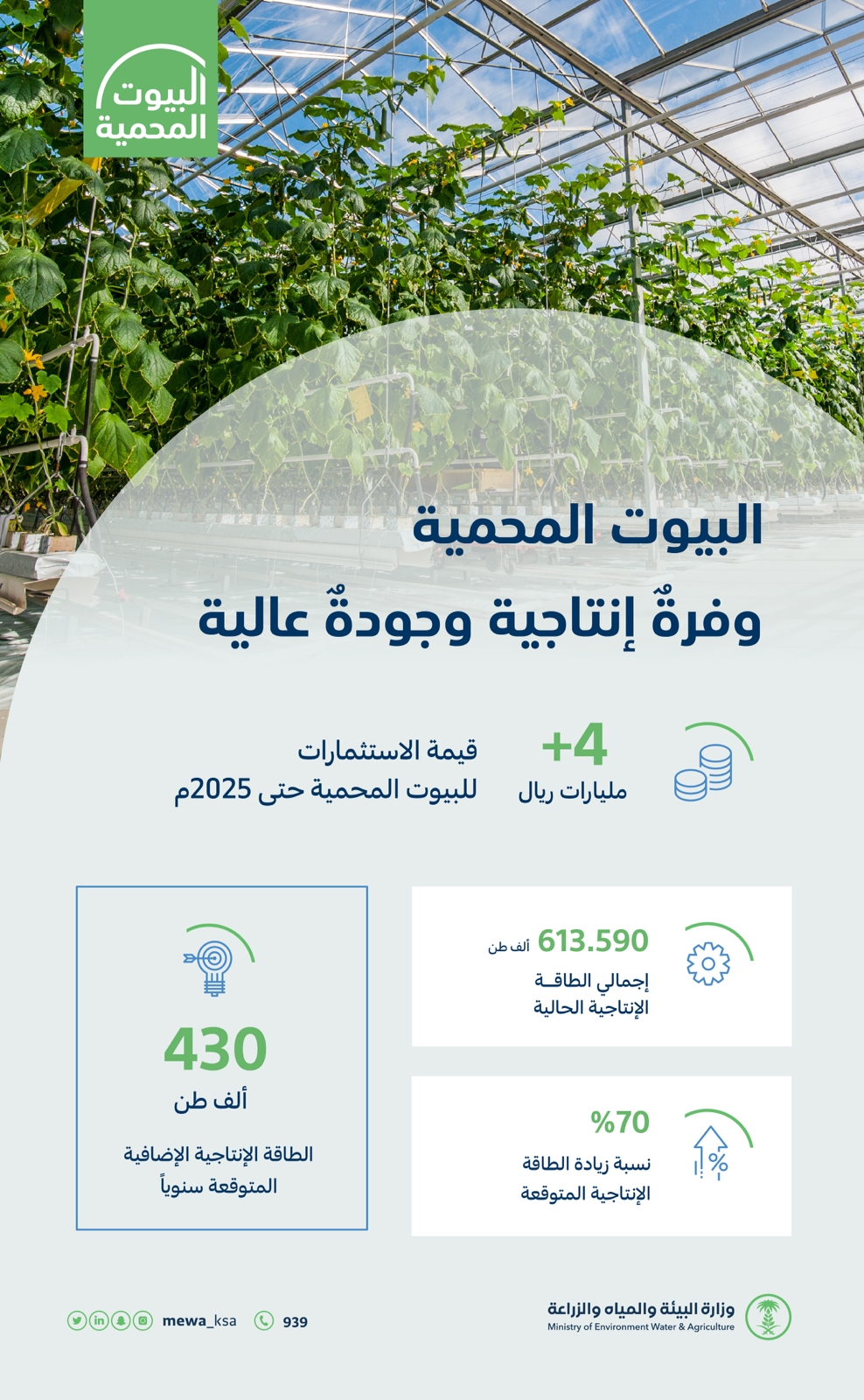 وأكد معالي الوزير، أن الخطة التوسعية المعتمدة خلال الفترة (2023- 2025م)، ستسهم في إنتاجية إضافية تقدر بـ 430 الف طن، لتصل الطاقة الإنتاجية الاجمالية للبيوت المحمية الى مايزيد عن مليون طن سنوياً؛ عبر ضخ استثمارات جديدة في قطاع الثروة النباتية والبيوت المحمية بقيمة تتجاوز (4) مليارات ريال حتى 2025م؛ وتهدف إلى تحقيق الأمن الغذائي الوطني، وزيادة المساهمة في المحتوى المحلي، وتوفير فرص العمل وفق مستهدفات رؤية المملكة 2030.