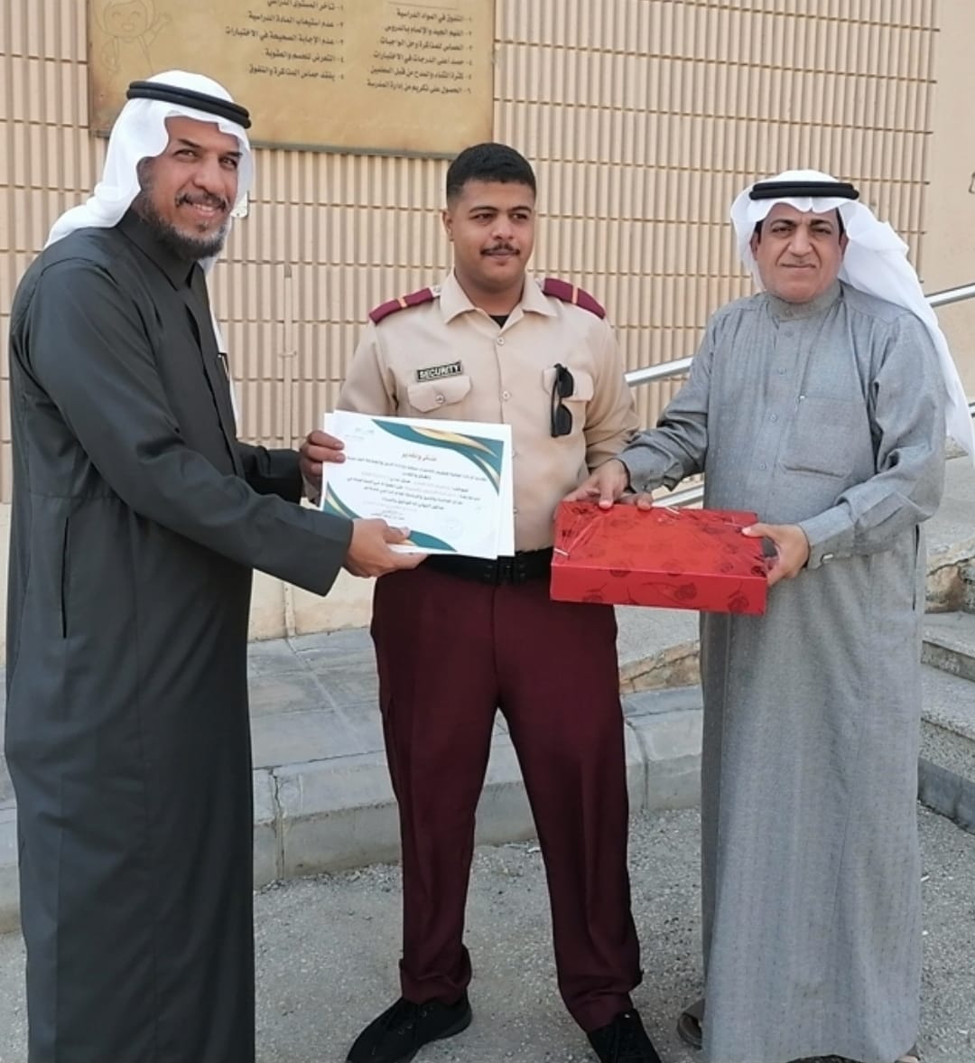 إيمانا وعرفانا بالدور الذي يقوم به حراس المدارس ورجال الأمن بها ، كرم ولي أمر الطالبة – تبارك الغزال – حارس ورجل أمن مدرسة (الأربعون الابتدائية) بحي الملك فهد بالهفوف (( الداخل المحدود )) الحارس – سامي