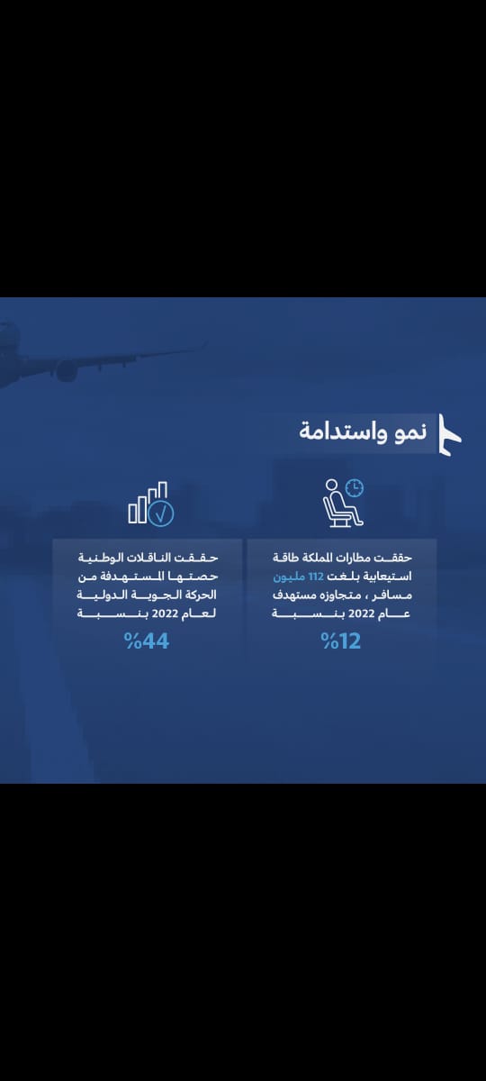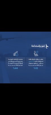 وبلغة الأرقام حقق قطاع السفر الجوي معدلات تعافيي تصاعدية نتيجة رفع قيود السفر بعد جائحة كورونا وتضاعف حركة السفر جوًا وازداد إقبال الركاب على السفر مقارنة بعام 2019م حيث بلغ نسبة التعافي في أعداد المسافرين 84? وفي أعداد المسافرين العابرين بنسبة 82? في حين بلغ نسبة التعافي في حجم الشحن الجوي المتداول 87 %.