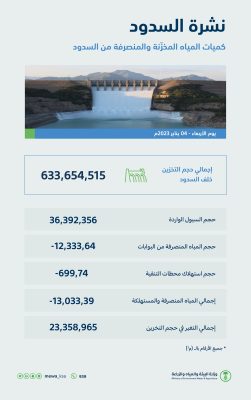 وبيّن التقرير كميات المياه المخزّنة والمنصرفة من السدود) حيث بلغ إجمالي حجم التخزين (633.654.515) م3، فيما بلغ حجم السيول الواردة (36.392.356)م3، وحجم المياه المنصرفة من البوابات (-12.333.64)م3، وبلغ حجم استهلاك محطات التقنية (-699.74)م3، وإجمالي المياه المنصرفة والمستهلكة (-13.033039)، بينما بلغ إجمالي التغير في حجم التخزين (23.358965)م3.