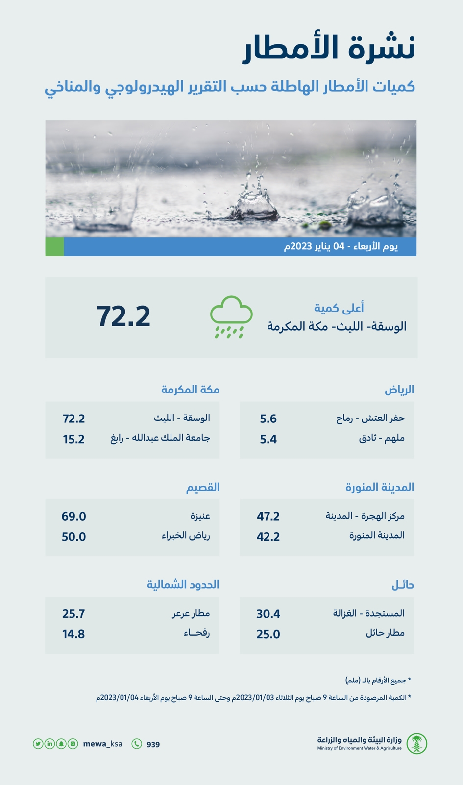 جاء ذلك في تقرير لوزارة البيئة والمياه والزراعة لرصد كميات هطول الأمطار بمناطق المملكة؛ حيث سجلت محافظة عنيزة بمنطقة القصيم (69.0) ملم،فيما سجلت محافظة رياض الخبراء (50.0) ملم، وفي منطقة المدينة المنورة سجّل مركز الهجرة – المدينة (47.2) ملم، و المدينة المنورة (42.2) ملم، بينما سجّلت منطقة حائل (30.4) ملم في قرية المستجدة – محافظة الغزالة، و(25.0) في مطار حائل، وفي منطقة الحدود الشمالية سجّل مطار عرعر (25.7) ملم، ورفحاء (14.8)، وسجلت قرية حفر العنش في محافظة رماح بمنطقة الرياض (5.6) ملم، وملهم في ثادق (5.4) ملم.