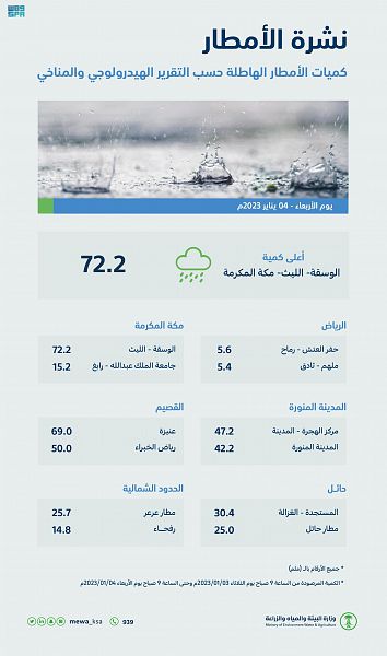جاء ذلك في تقرير لوزارة البيئة والمياه والزراعة لرصد كميات هطول الأمطار بمناطق المملكة، حيث سجَّلت محافظة عنيزة بمنطقة القصيم (69.0) ملم،فيما سجَّلت محافظة رياض الخبراء (50.0) ملم، وفي منطقة المدينة المنورة سجَّل مركز الهجرة – المدينة (47.2) ملم، والمدينة المنورة (42.2) ملم، بينما سجَّلت منطقة حائل (30.4) ملم في قرية المستجدة – محافظة الغزالة، و(25.0)ملم في مطار حائل، وفي منطقة الحدود الشمالية سجَّل مطار عرعر (25.7) ملم، ورفحاء (14.8)ملم، وسجلت قرية حفر العتش في محافظة رماح بمنطقة الرياض (5.6) ملمترات، وملهم في ثادق (5.4) ملمترات.