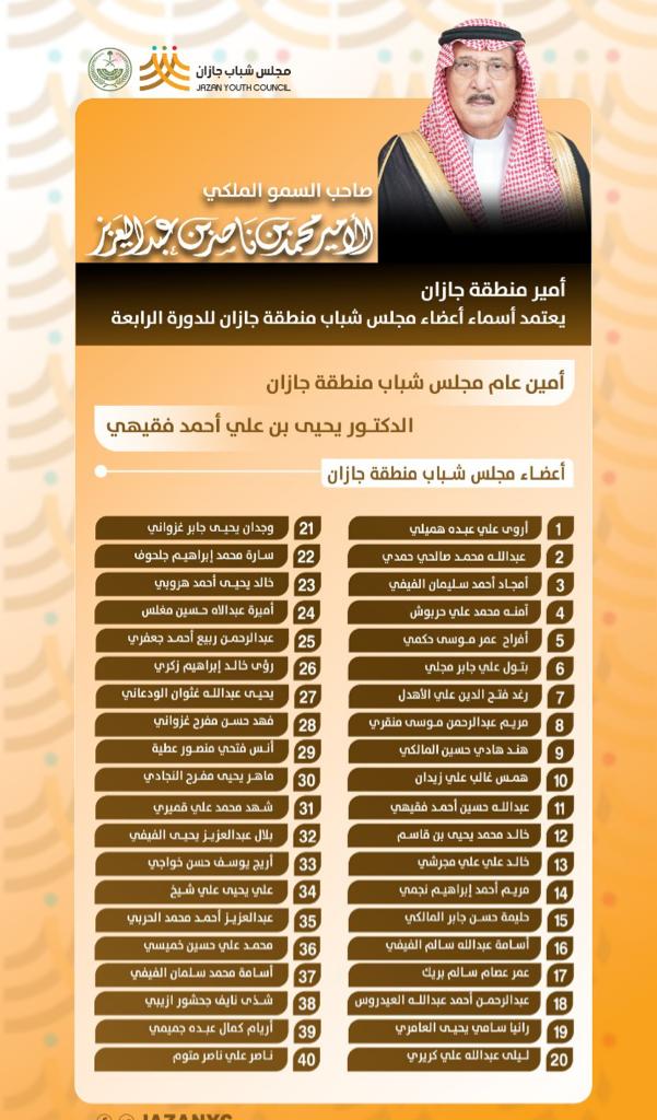 أصدر صاحب السمو الملكي الأمير محمد بن ناصر بن عبدالعزيز أمير منطقة جازان، رئيس مجلس شباب المنطقة اليوم , قراراً يقضي بإعادة تشكيل مجلس شباب المنطقة في دورته الرابعة، وفقاً للائحة التنظيمية للمجلس،